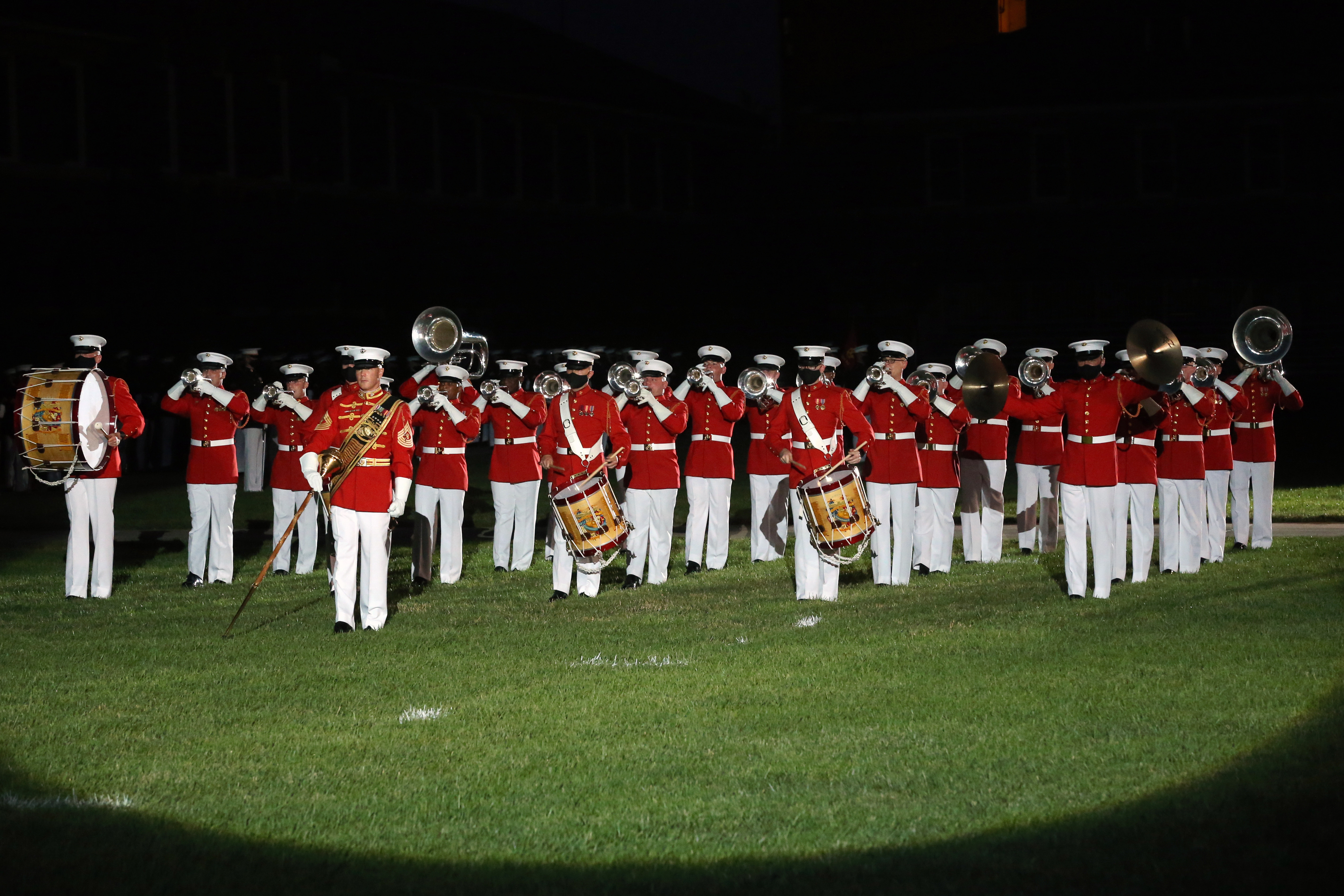 Master Gunnery Sgt. Duane King, drum major, “The President’s Own,” United States Marine Band, conducts the band during the Friday Evening Parade at Marine Barracks Washington, D.C., June 26, 2020. To maximize safety precautions during this year’s parade season, “The President’s Own” reduced the number of marching musicians from 36 to 25 and spread out their formation to increase physical distancing between the Marines. The hosting official for the evening was Col. Teague A. Pastel, commanding officer, Marine Barracks Washington, and the 38th Commandant of the Marine Corps, Gen. David H. Berger, was the guest of honor. (U.S. Marine Corps photo by Sgt. Robert Knapp)