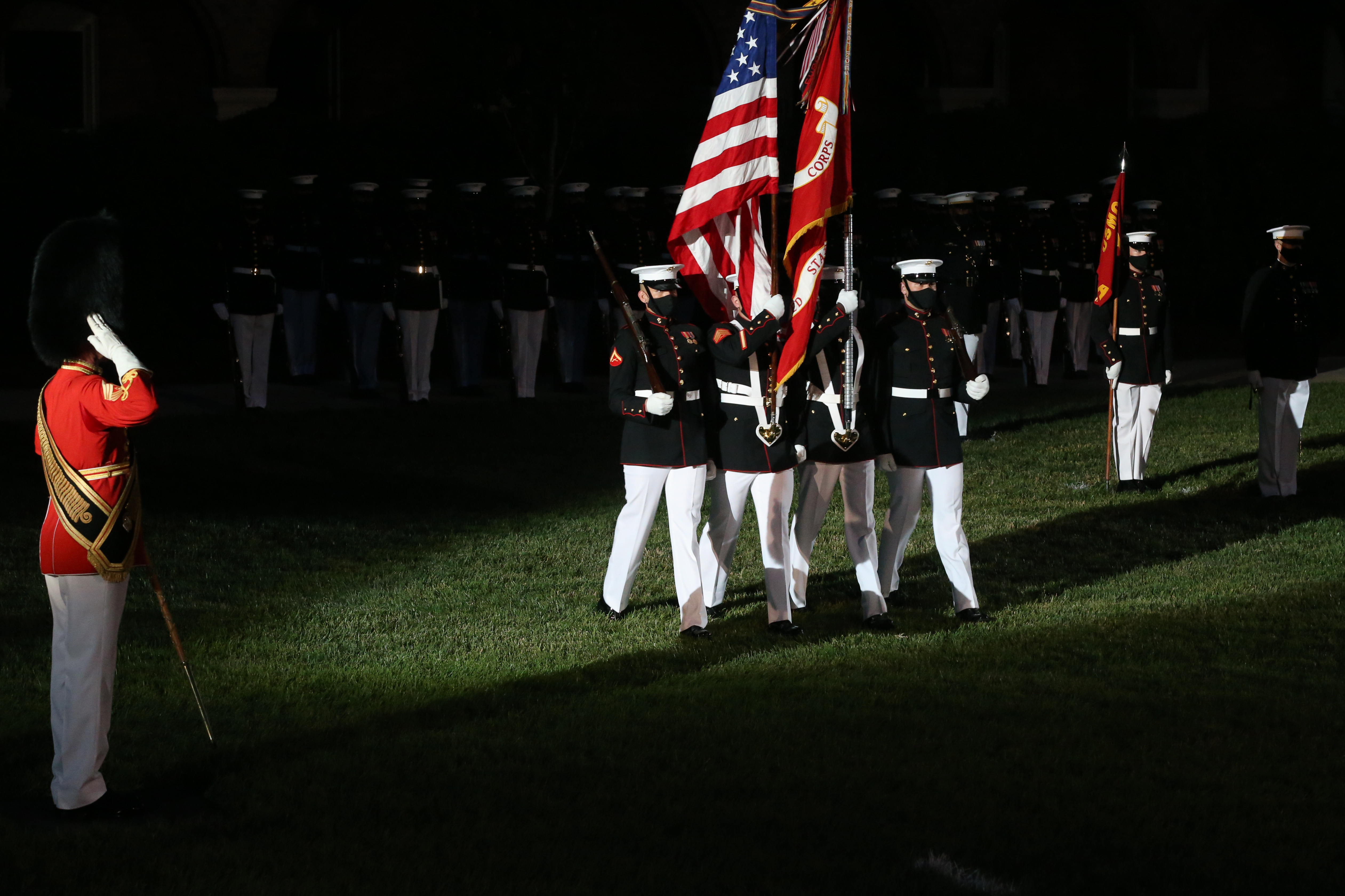 The parade staff marches down center walk during the Friday Evening Parade at Marine Barracks Washington, D.C., June 26, 2020. Following Department of Defense guidelines and Centers for Disease Control and Prevention (CDC) recommendations, Marines are wearing cloth face coverings during parades this year in an effort to maximize the health and safety of Barracks personnel and guests. The hosting official for the evening was Col. Teague A. Pastel, commanding officer, Marine Barracks Washington, and the 38th Commandant of the Marine Corps, Gen. David H. Berger, was the guest of honor. (U.S. Marine Corps photo by Lance Cpl. Allen Sanders)