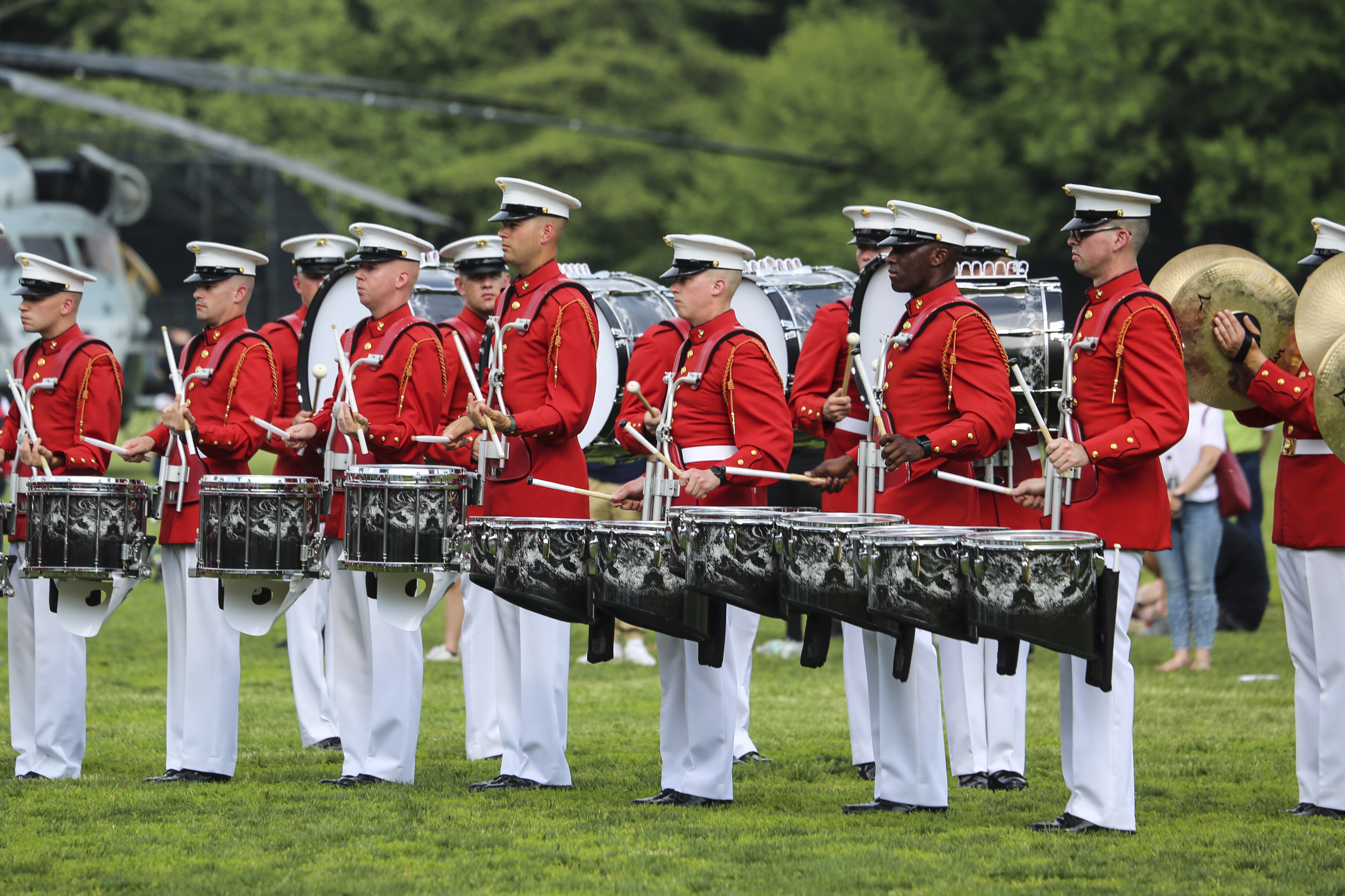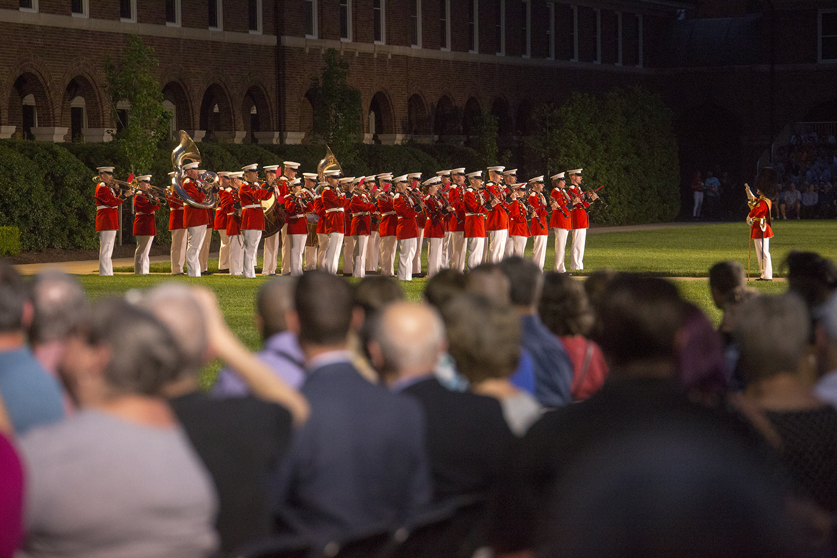 Marines with “The Commandant’s Own” U.S. Marine Drum & Bugle Corps march onto the parade deck during the Friday Evening Parade at Marine Barracks Washington D.C., June 1, 2018. The hosting official for the parade was Lt. Gen. Rex McMillian, commanding general, Marine Forces Reserve and Marine Forces North, and the guest of honor was retired Lt. Gen. Robert M. Shea, chairman of Marine Toys for Tots Foundation Board of Directors and president and CEO of the Armed Forces Communications and Electronics Association.