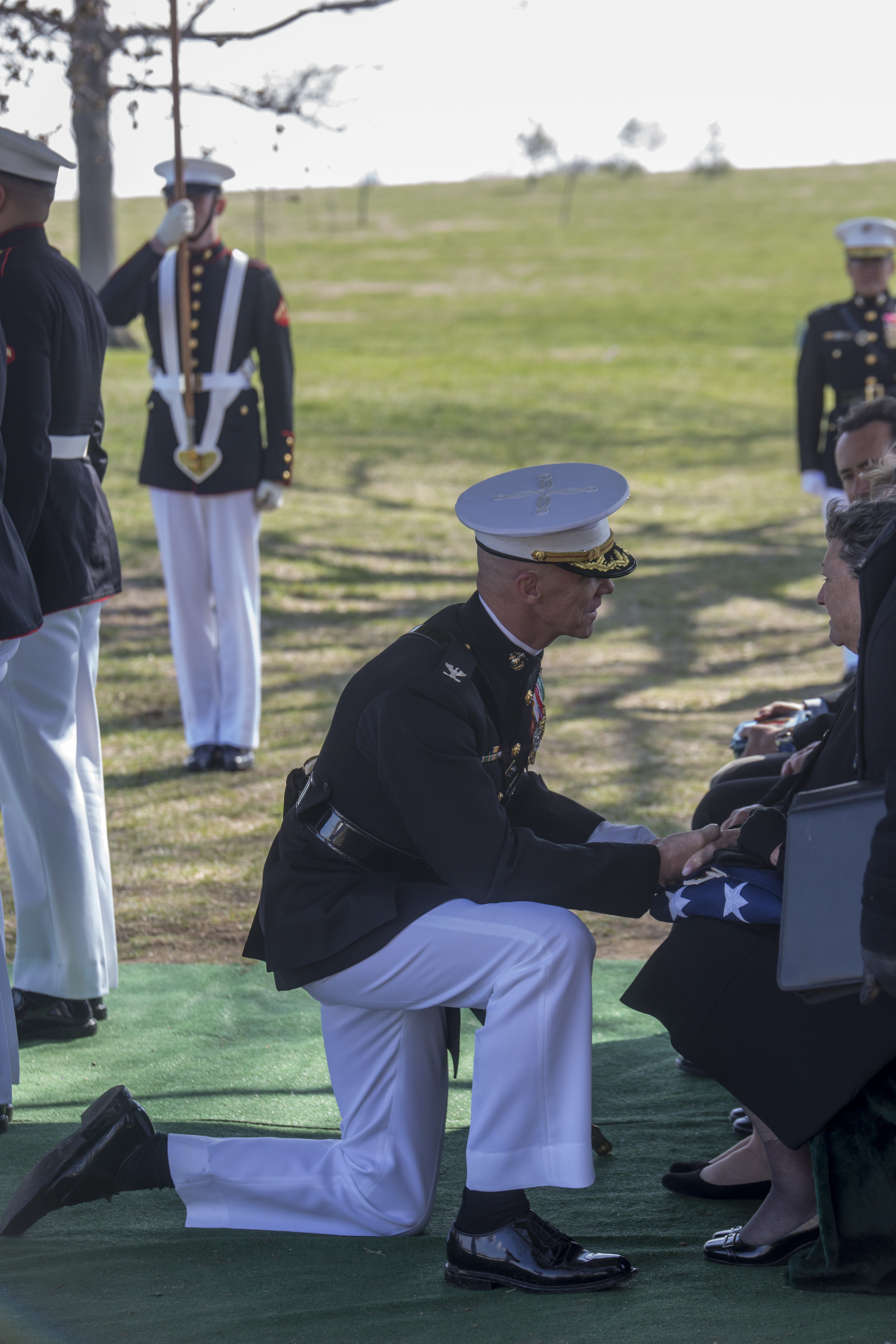 Colonel Tyler J. Zagurski, commanding officer, Marine Barracks Washington D.C., presents the National Flag to the next of kin during a full honors funeral for Maj. Gen. John A. Studds at Arlington National Cemetery, Arlington, Va, April 10, 2018. General Studds was commissioned into the Marine Corps in 1960 and served the following 33 years as an Infantry Officer. He commanded Marines at all levels including; Commander, Charlie Company, 3rd Reconnaissance Battalion in Vietnam where he received the Bronze Star with Combat "V" for valor and was the Director of Marine Corps Intelligence during Operations Desert Shield and Desert Storm. Studds concluded his devout career as the Commanding General, Marine Corps Recruit Depot, San Diego. (Official U.S. Marine Corps photo by Sgt. Robert Knapp/Released)