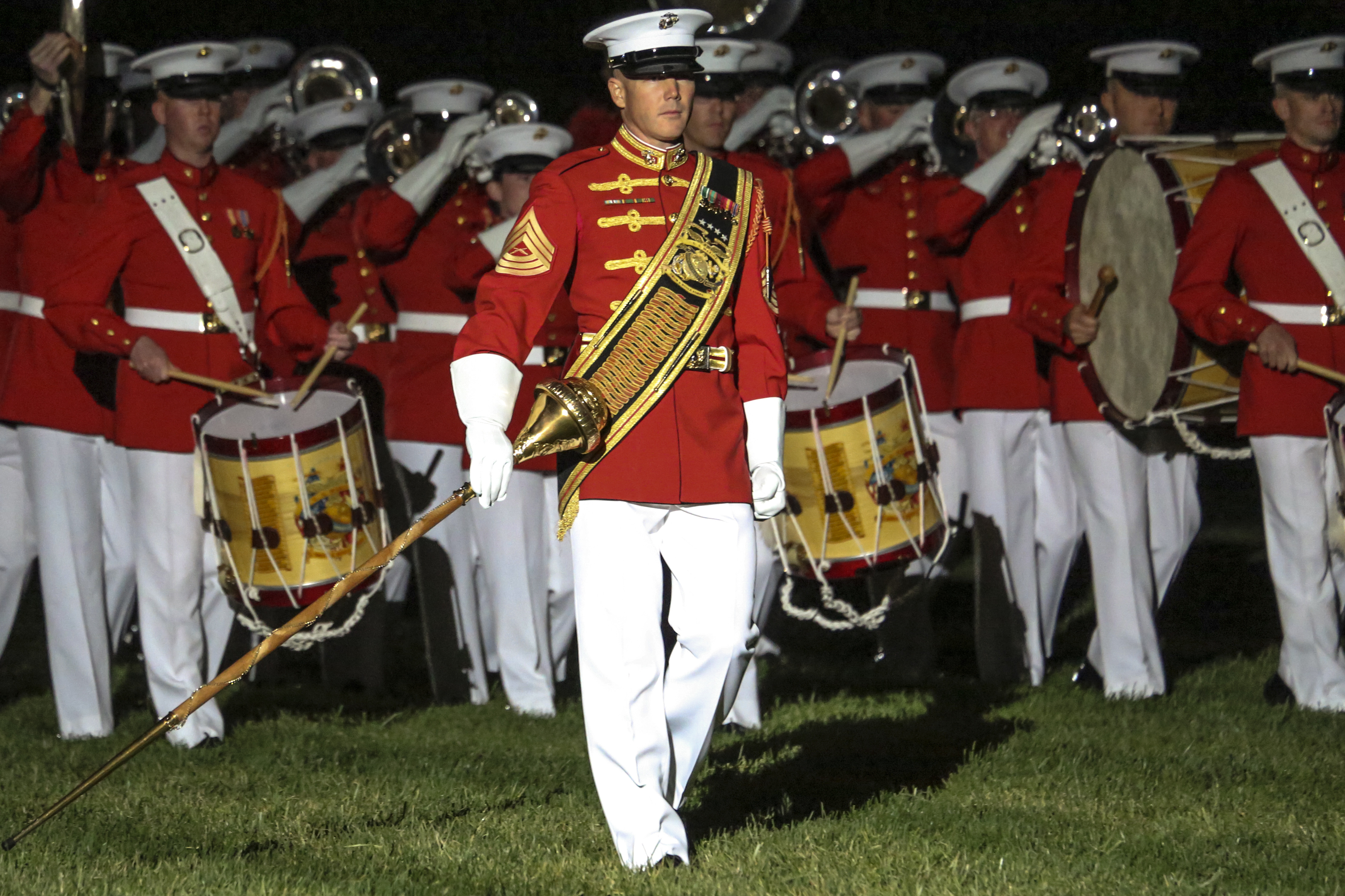 Master Sgt. Keith Martinez, drum major, “The Commandant’s Own” U.S. Marine Drum & Bugle Corps, leads the D&B across the parade field during a Friends and Family Ceremony at Marine Barracks Washington D.C., Apr. 27, 2018. The guest of honor for the parade was the Commandant of the Marine Corps Gen. Robert B. Neller and the hosting official was the Marine Barracks Washington D.C. Commanding Officer Col. Tyler J. Zagurski. (Official Marine Corps photo by Cpl. Damon Mclean/Released)