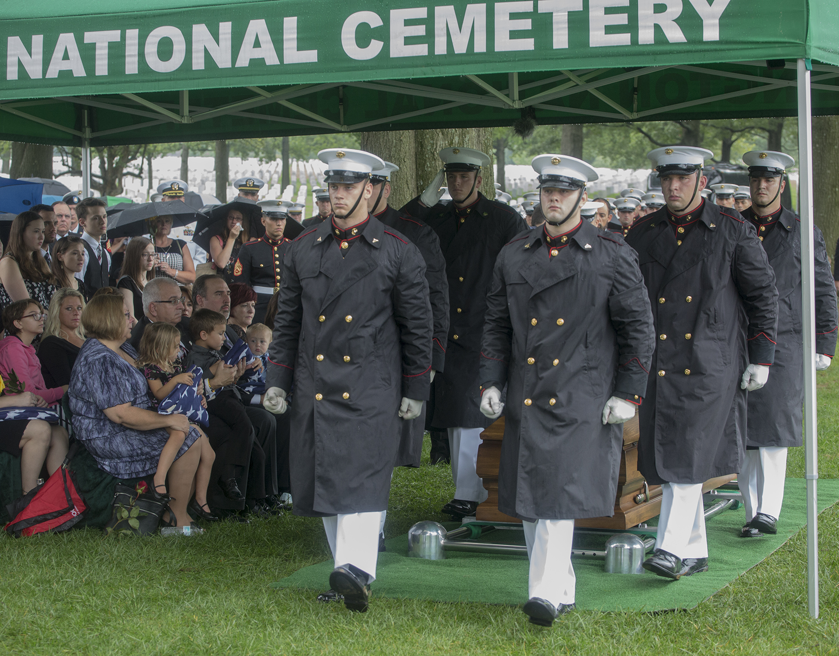 Marine Corps Body Bearers with Bravo Company, Marine Barracks Washington D.C., conduct one final raise of the casket before letting it down during a funeral for Marine Sgt. Joseph J. Murray at Arlington National Cemetery, Arlington, Va., Aug. 15, 2017. Murray, 26, was one of the 15 Marines and one Navy sailor who perished when their KC130-T Hercules crashed in Mississippi, July 10, 2017. Murray was a Critical Skills Operator with the 2nd Raider Battalion, Marine Corps Forces Special Operations Command (MARSOC). The Body Bearers execute a final ceremonial raise of the casket to eye-level for ten seconds as a sign of respect and one last render of honor to the fallen Marine. (Official U.S. Marine Corps photo by Cpl. Robert Knapp/Released)