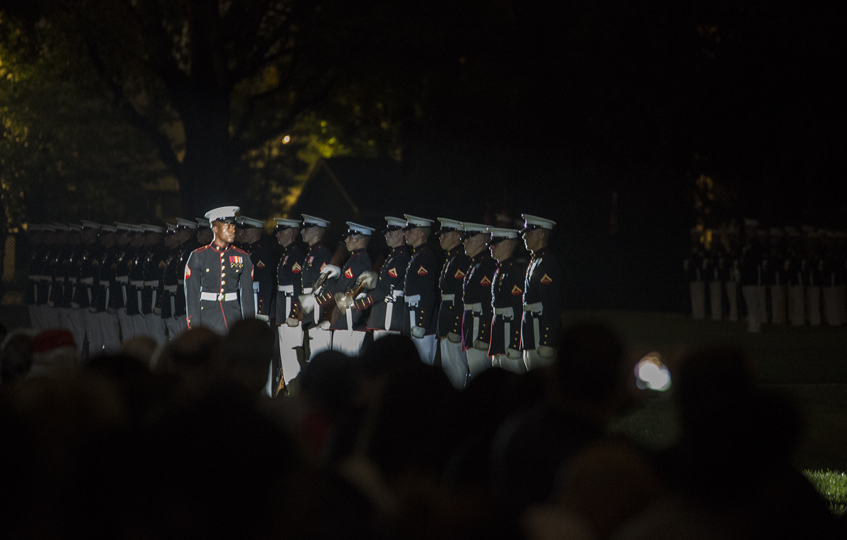 Marines of the color detail, Marine Barracks Washington D.C., conduct evening colors at the conclusion of a Friday Evening Parade at the Barracks, Aug. 18, 2017. The guest of honor for the parade was the Superintendent of the U.S. Naval Academy, Vice Adm. Walter E. Carter, Jr., and the hosting official was the Deputy Commandant, Combat Development and Integration Commanding General, Marine Corps Combat Development Command, Lt. Gen. Robert S. Walsh. (Official Marine Corps photo by Lance Cpl. Damon McLean/Released)