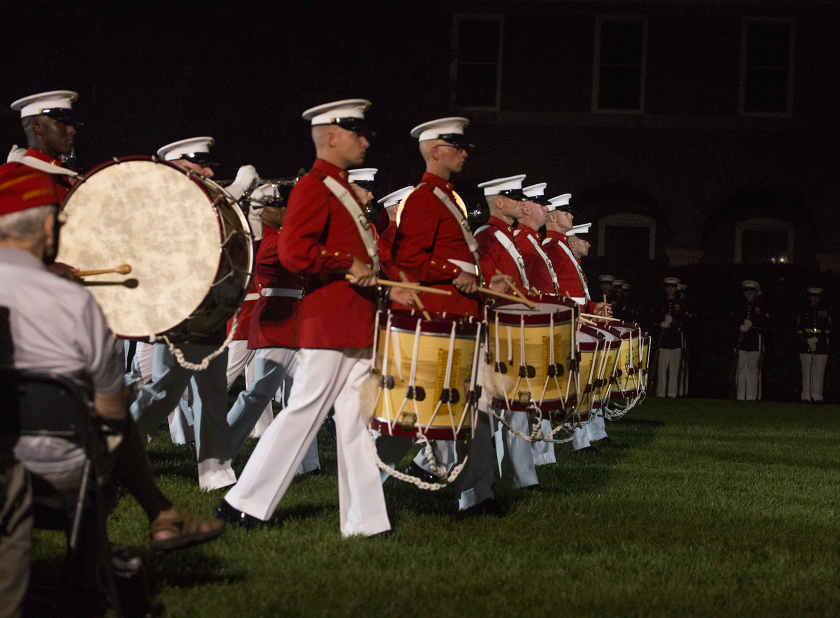 Marines with “The Commandant’s Own” U.S. Marine Drum & Bugle march across the parade deck during a Friday Evening Parade at Marine Barracks Washington D.C., Aug. 18, 2017. The guest of honor for the parade was the Superintendent of the U.S. Naval Academy, Vice Adm. Walter E. Carter, Jr., and the hosting official was the Deputy Commandant, Combat Development and Integration Commanding General, Marine Corps Combat Development Command, Lt. Gen. Robert S. Walsh. (Official Marine Corps photo by Lance Cpl. Damon McLean/Released)